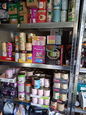 Nun sind unsere Regale gut gefüllt, aber bei den vielen Katzen die wir momentan auf Pflegestellen versorgen und über 30 Futterstellen in und um Wiesbaden sind die Vorräte so schnell aufgebraucht wie sie uns erreichen. Gerade in der kalten Jahreszeit füttern wir mehr draussen. Deshalb freuen wir uns immer über Spenden - schauen Sie doch mal auf unserer Amazon-Wunschliste vorbei.
