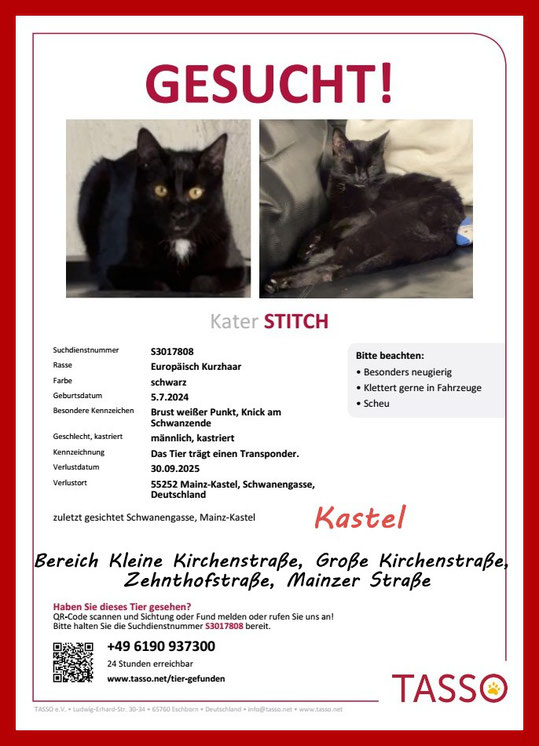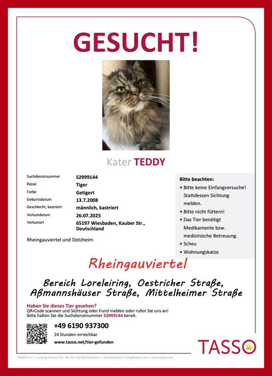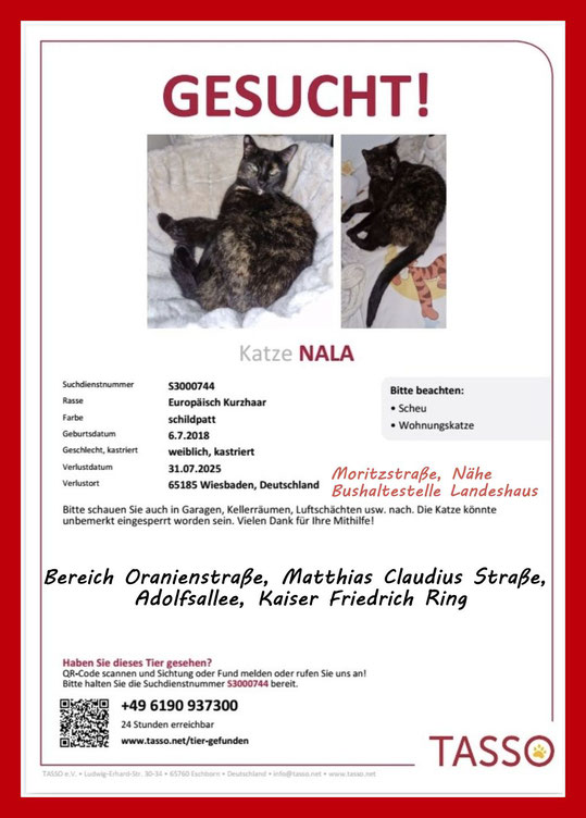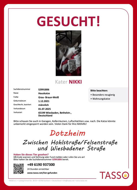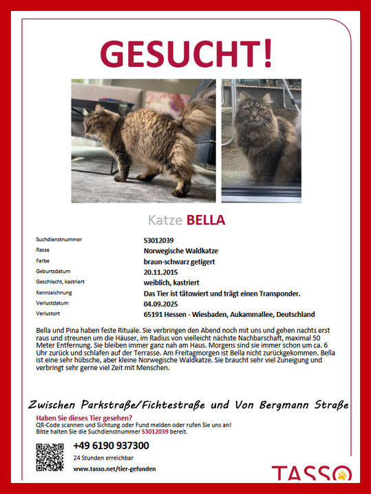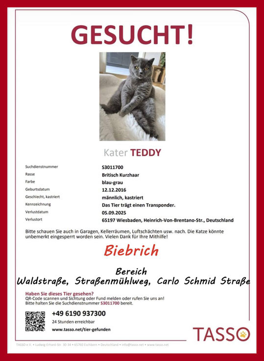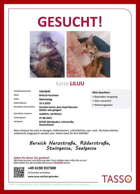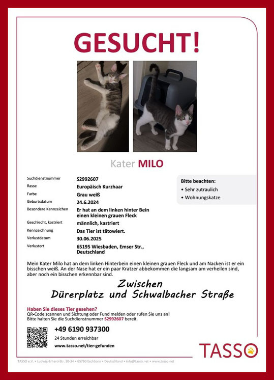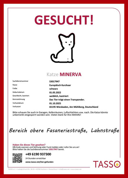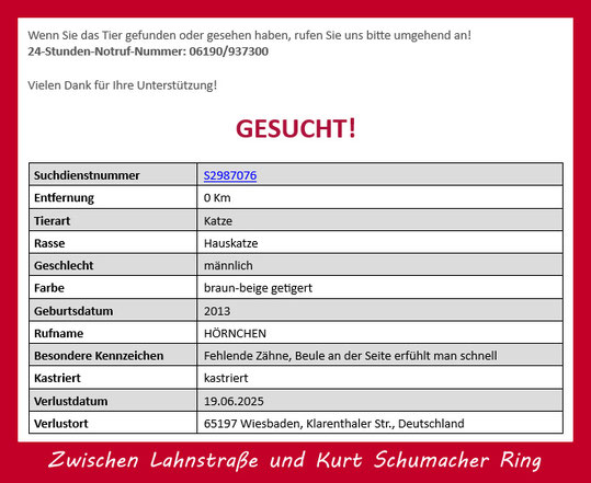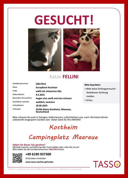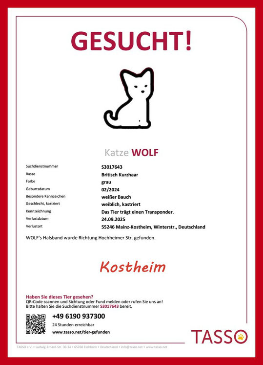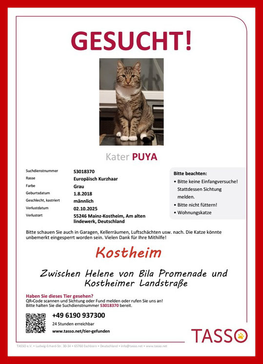 Wenn Sie Ihre Katze vermissen, können Sie uns gerne kontaktieren. Wir veröffentlichen Ihre Suchmeldung auf unserer Website. Wenn Sie Fotos von Ihrer Katze haben, fügen Sie diese bitte der E-Mail bei.